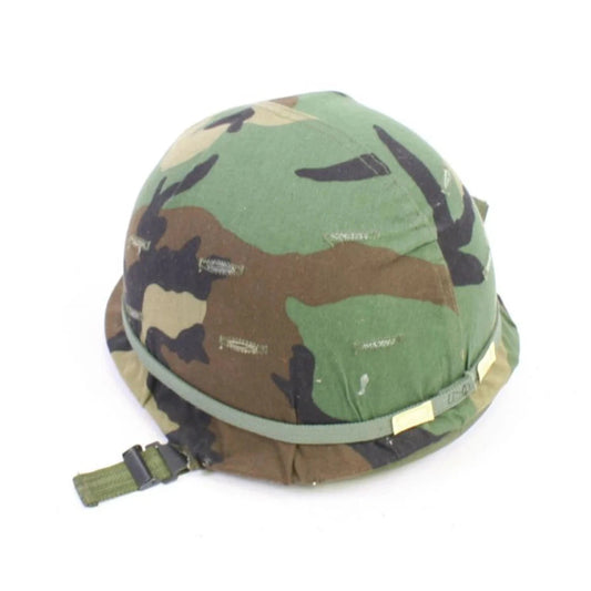US army M1 Helmet with Woodland cover, surplus in good condition. Vietnam War era.